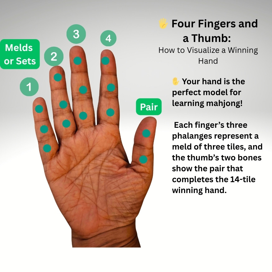 Have you ever looked at your mahjong tiles and thought, How do these ever fit together into a winning hand? Here’s a simple way to picture it: your hand is like your own hand: four fingers and one thumb.